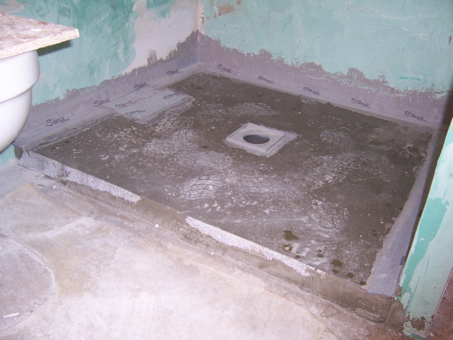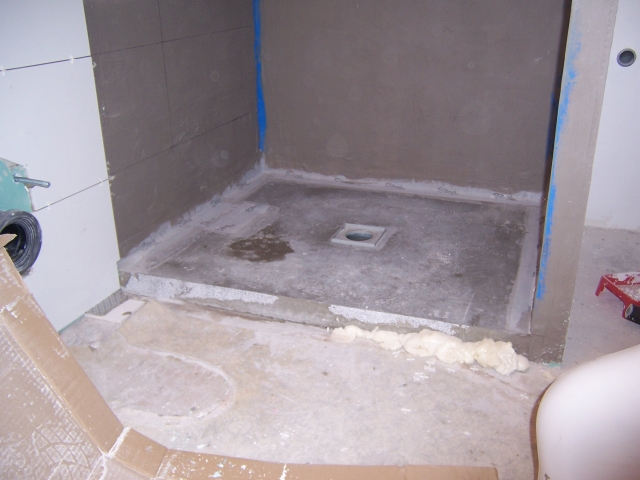Die Wände sind gestrichen, das Bodenelement der Dusche ist eingebaut, der Duschbereich ist abgedichtet, die Boxen sind drin und die ersten Fliesen sind gelegt:
