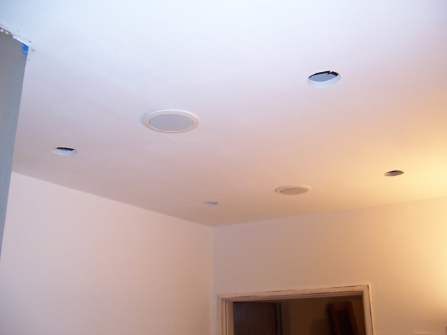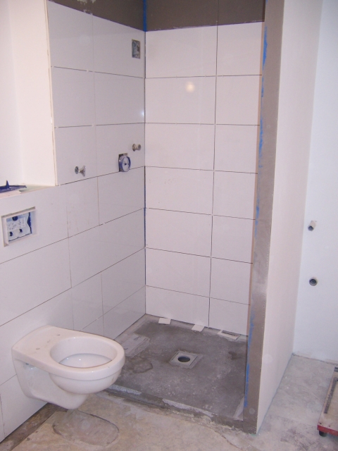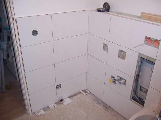 Es hat sich einiges getan: Die Wände sind gestrichen, das Bodenelement der Dusche ist eingebaut, der Duschbereich ist abgedichtet, die Boxen sind drin und die ersten Fliesen sind gelegt:
