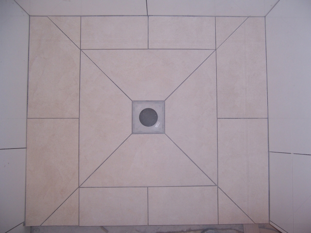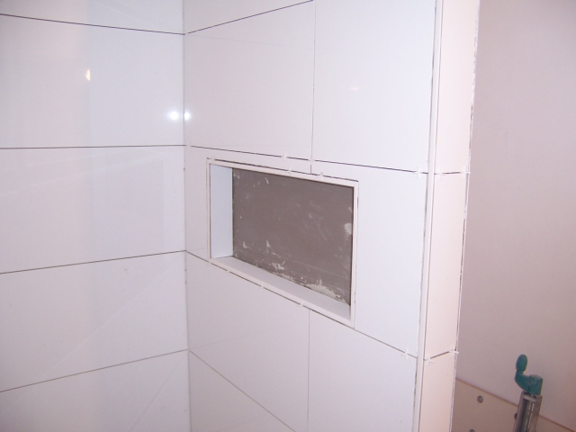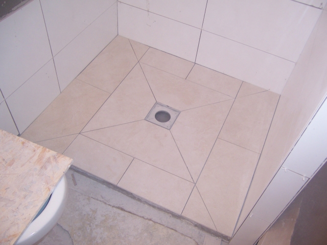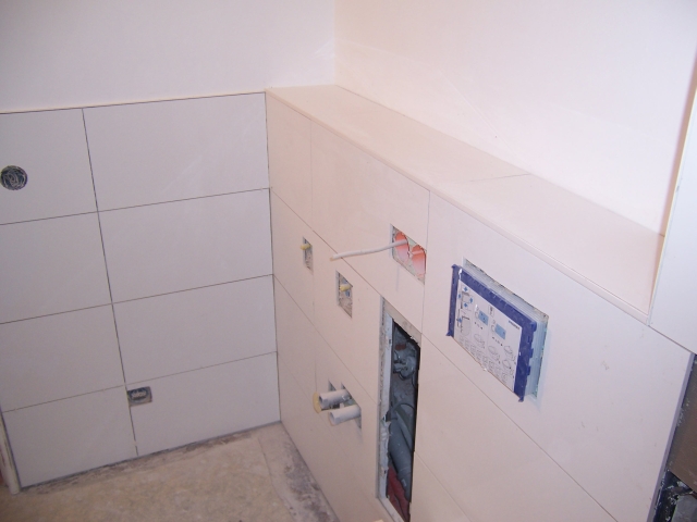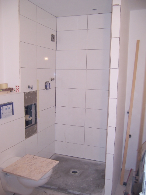 Die Wände sind fertig gefliest, die Fliesen vom Duschelement sind zugeschnitten: