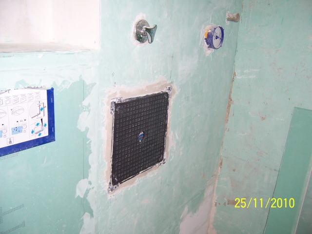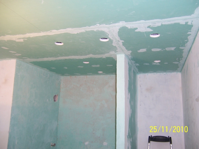 Nach kleinen Rückschlägen, wie ein angebohrtes Kabel und eine kleinere Handverletzung die mit 4 Stichen genäht wurde, ist der "nackte" Raum so gut wie fertig. Die abgehängte Decke ist drin und verspachtelt, die neue Revisionsklappe ist eingebaut: